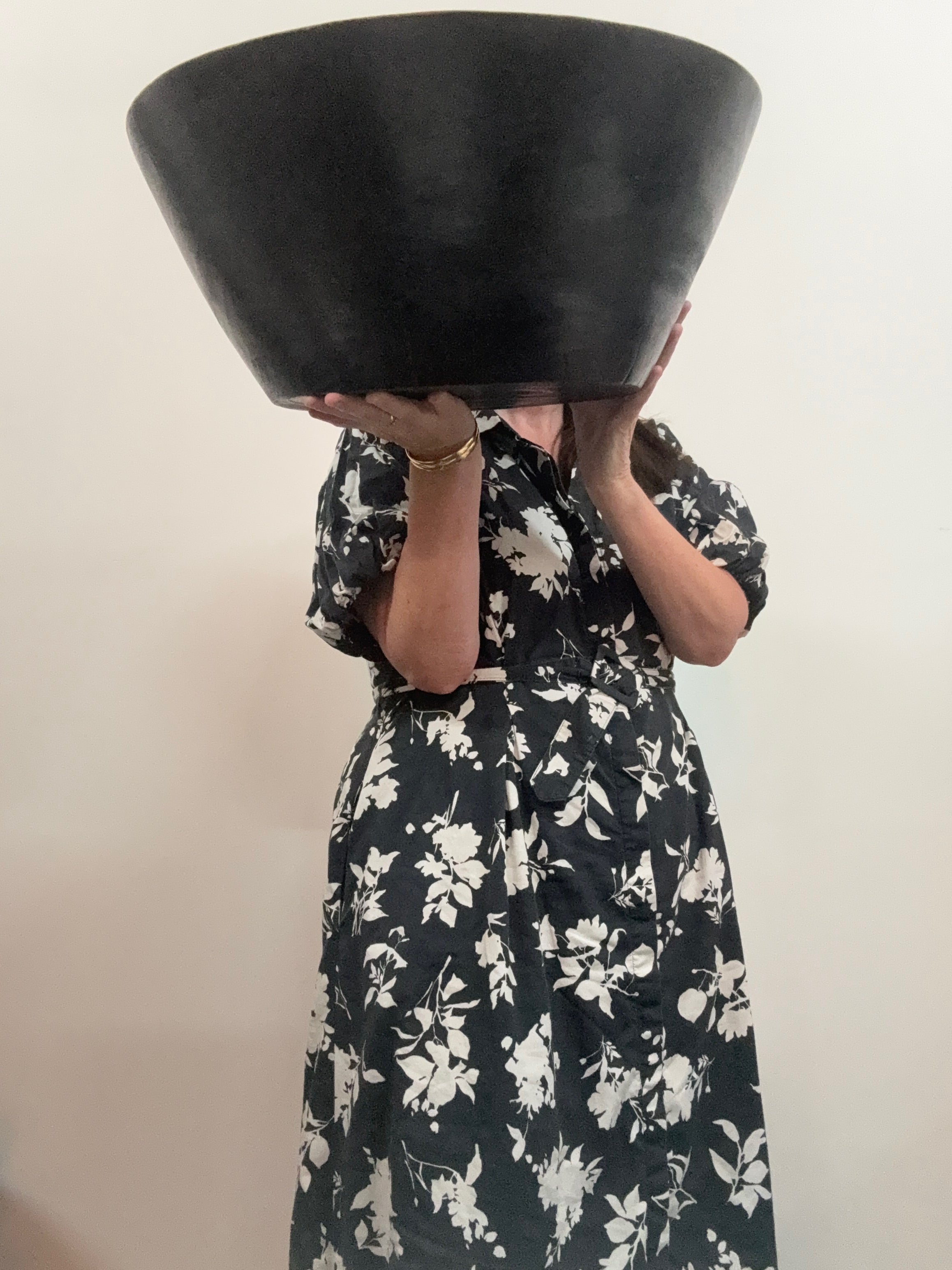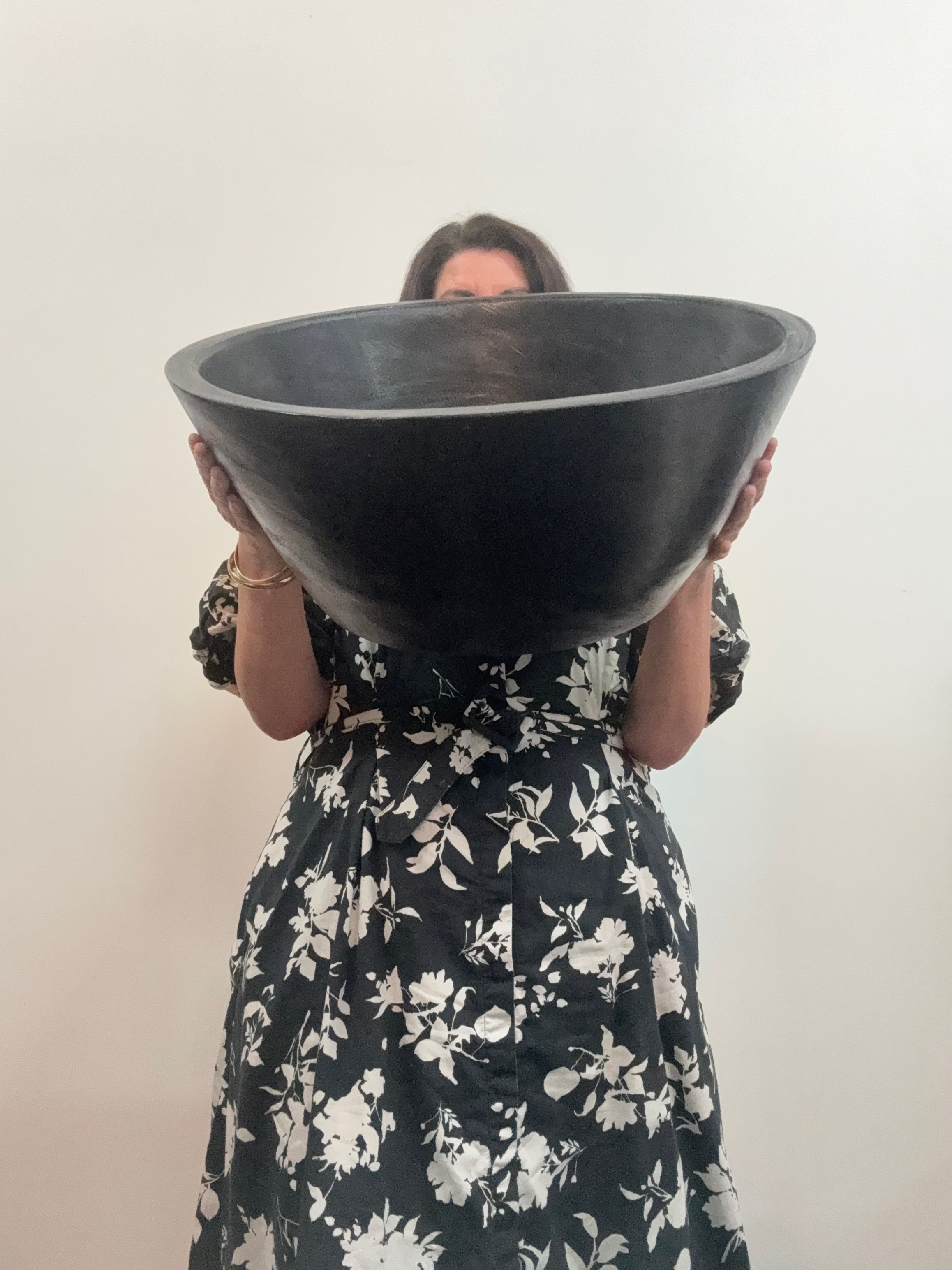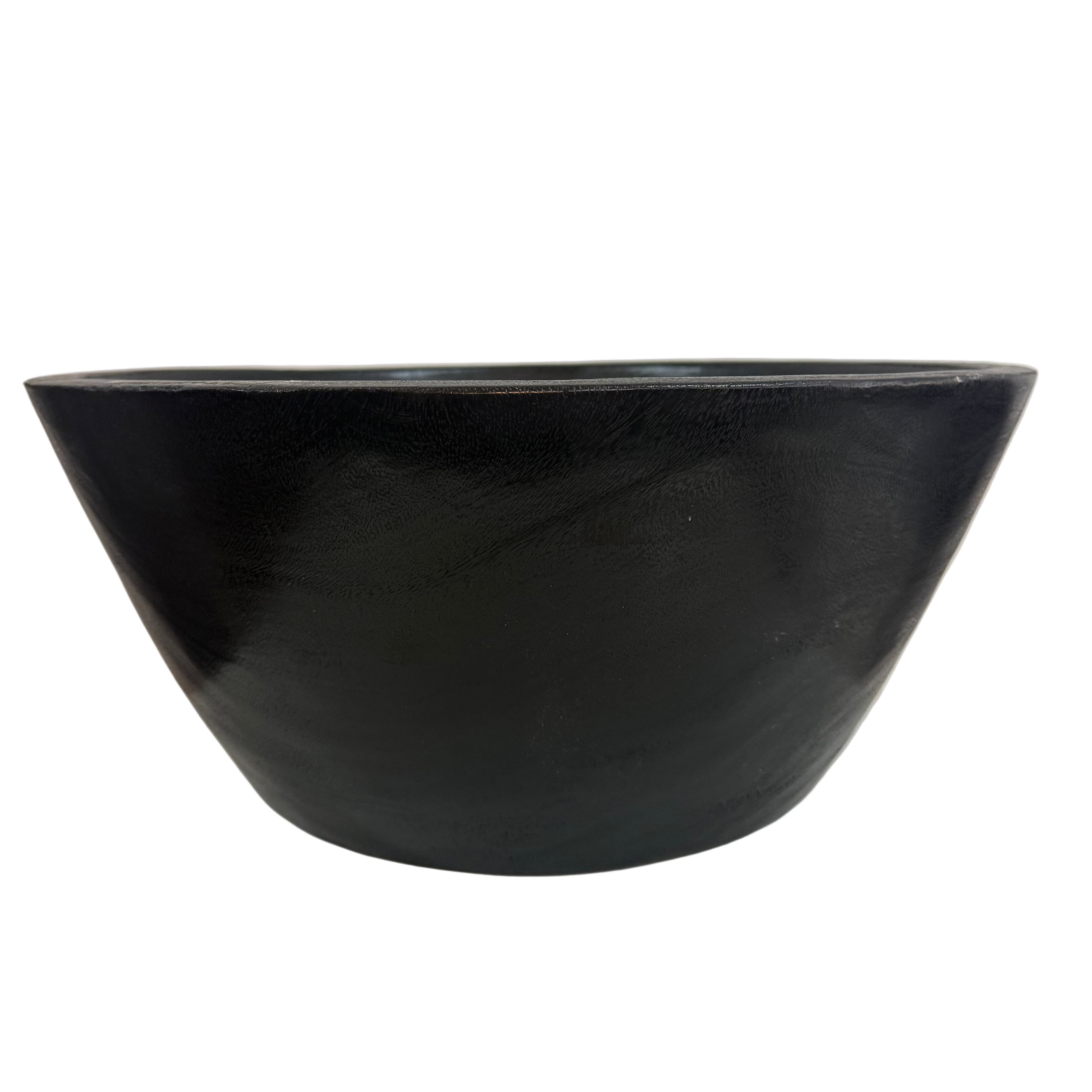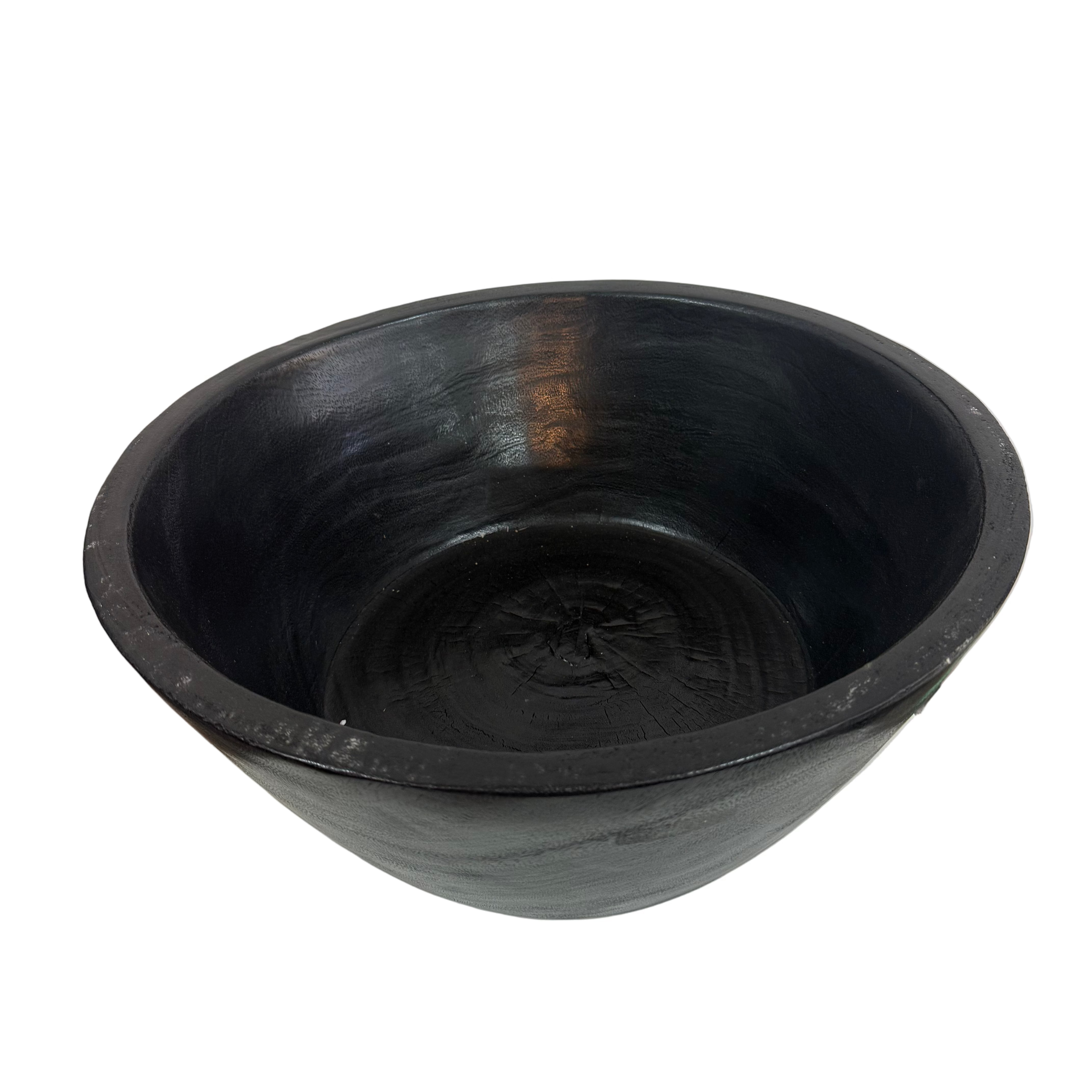 A large sculptural wooden bowl handcrafted from natural wood and finished using a blow-torch technique to achieve its deep, darkened surface. The result is a large piece with subtle texture and a rich, understated tone.