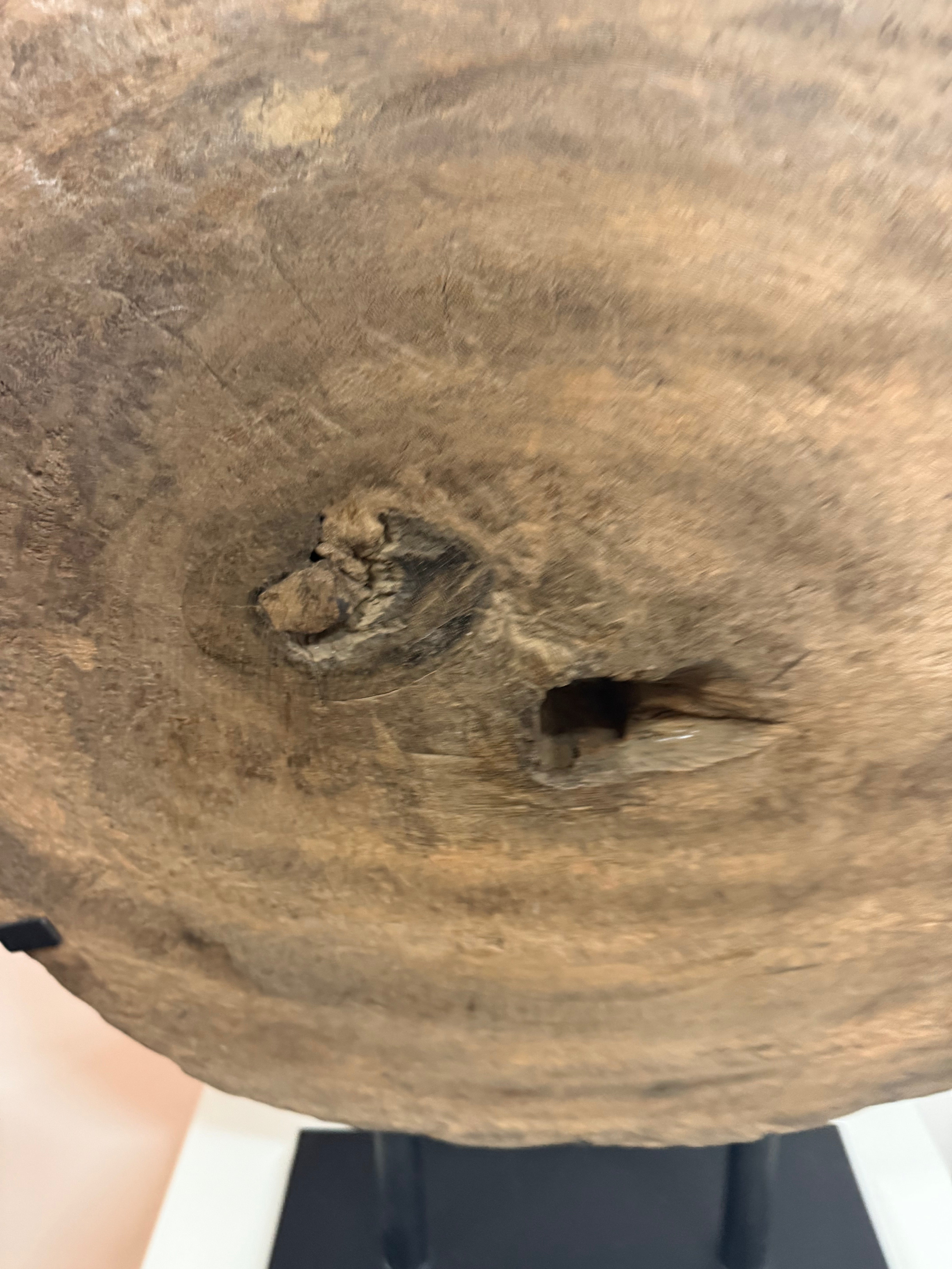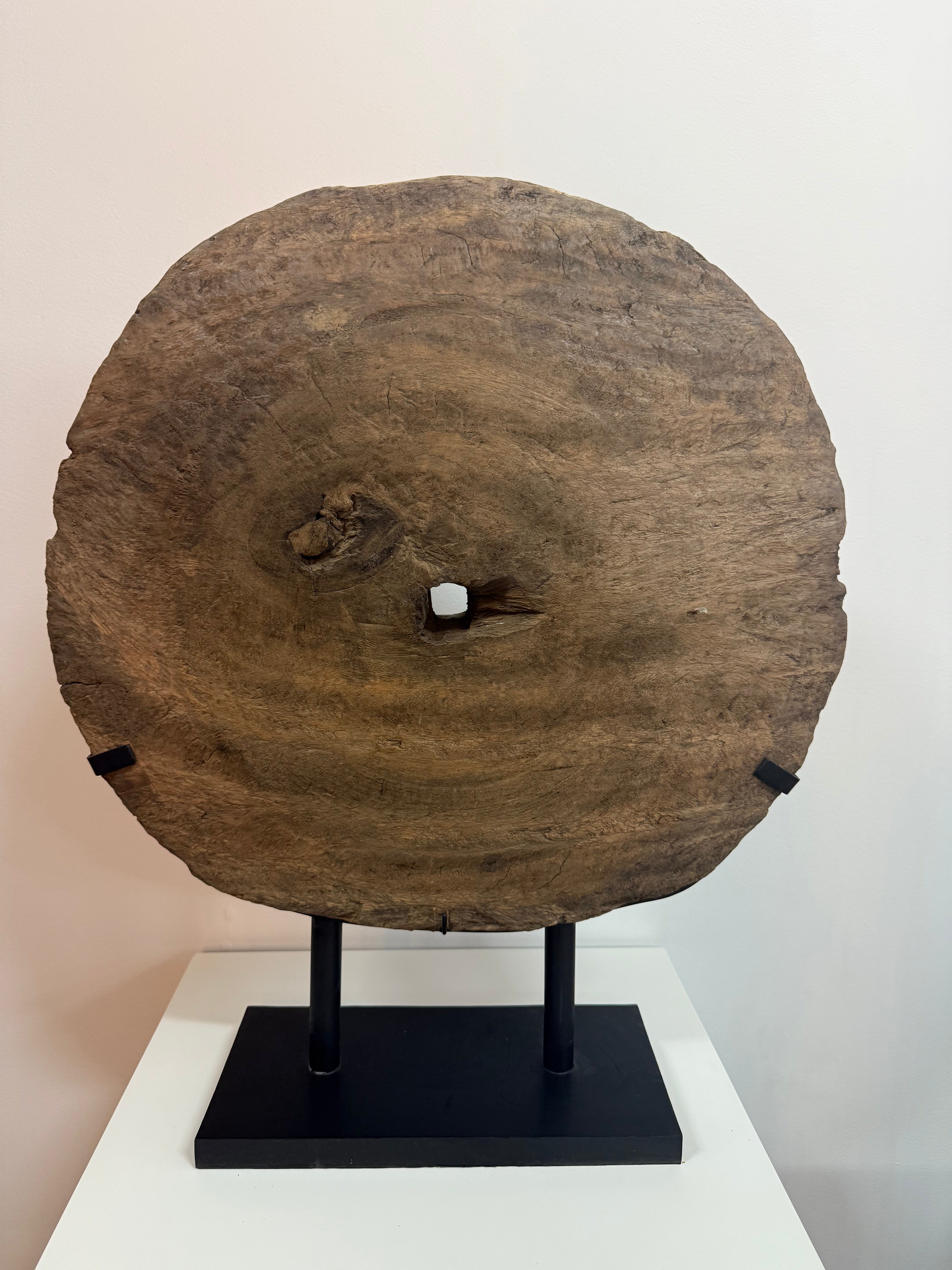 Once part of a traditional wooden flour mill, this reclaimed teak wheel from Java now stands as a sculptural object - a quiet piece of history reimagined for the modern home. Mounted on a custom metal stand, its worn surface and circular form bring balance and texture to any interior.